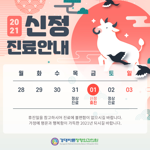 구미 경대바른정형외과, 1월1일(신정) 진료 안내 구미 경대바른정형외과에서는 새해인 1월 1일 신정에도 환자 여러분들께 최상의 의료 서비스를 제공하기 위해 진료를 진행하고자