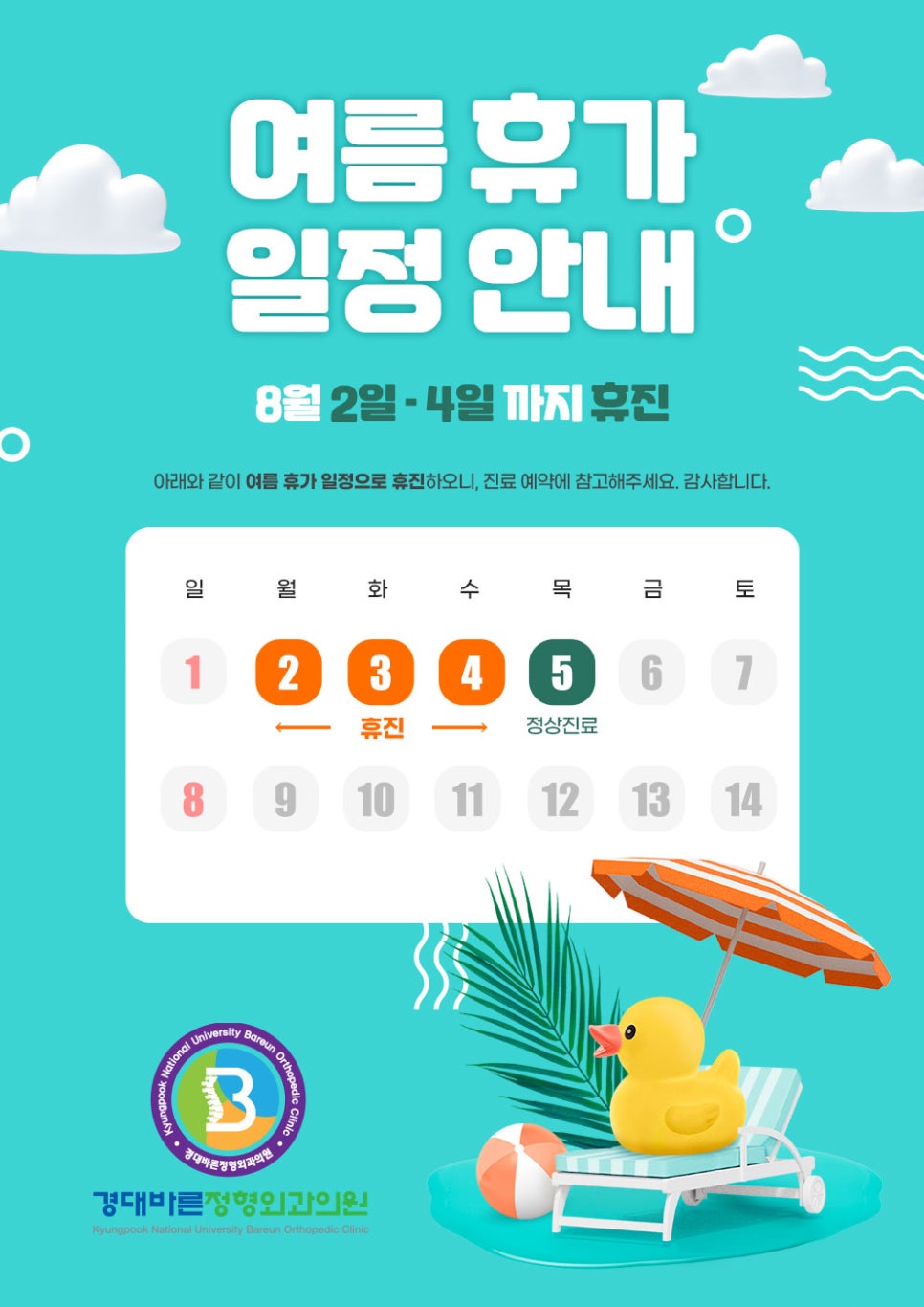 경대바른정형외과 여름휴가 일정 안내 여름이 다가오면서 다양한 사람들이 해변가나 산속으로 휴가를 떠납니다. 하지만 휴가철에는 우리 주변에도 많은 사람들이 다양한 이유로