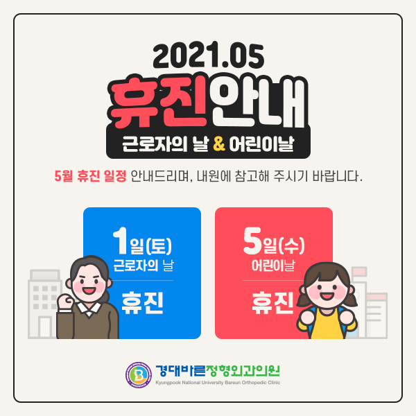 5월 휴진 안내: 근로자의 날, 어린이날 경대바른정형외과를 찾아주시는 환자 여러분께 감사드립니다. 5월은 국내에 있어서 근로자의 날과 어린이날을 비롯한 다양한 공휴일이