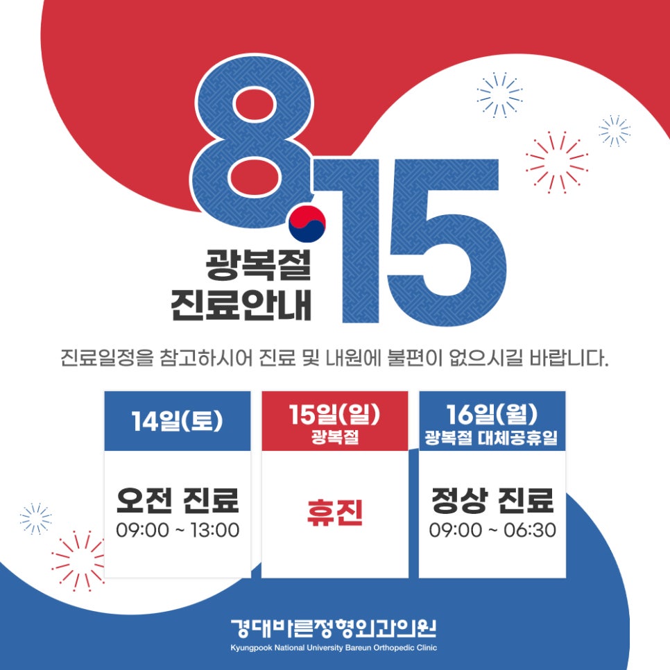 경대바른정형외과 :: 광복절 대체공휴일 진료안내 경대바른정형외과는 환자 여러분들의 편의를 위해 광복절 대체공휴일에도 진료를 진행하고 있습니다. 광복절은 국경일로서 공휴일로 지정되어 있지만,